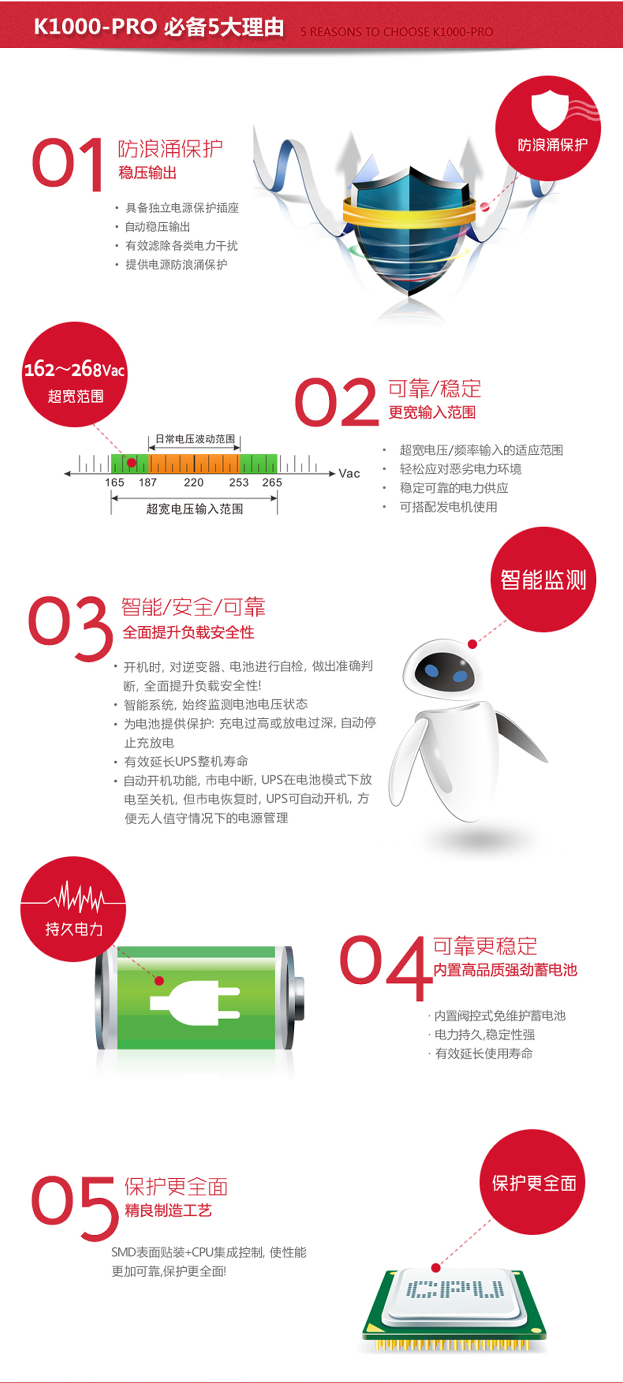 输入电压范围:162-268V 输入频率范围:45-55Hz 输出电压范围:220(1±10%)(电池模式下)V 输出频率范围:50(±1Hz)(电池模式下)Hz 其它输出参数:转换时间:10ms |